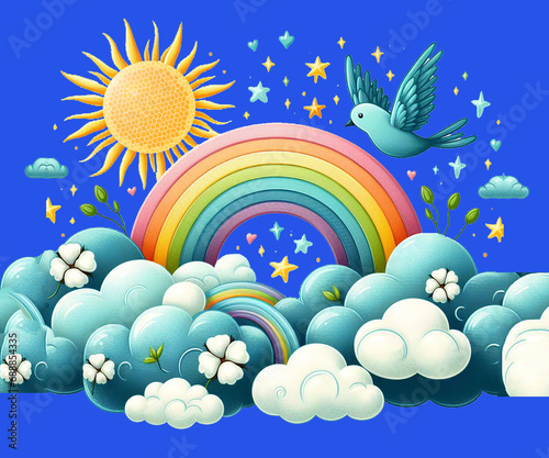 sky, cloud, rainbow, sun, nature, cloud, summer, light, star, blue, landscape, sunny, star, illustration