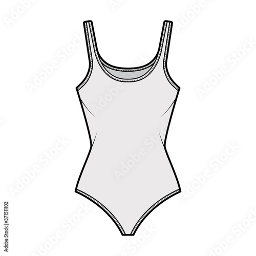 Cotton-jersey tank bodysuit technical fashion illustration with fitted body, sleeveless. Flat outwear cami apparel template front, grey color. Women men unisex top CAD mockup.