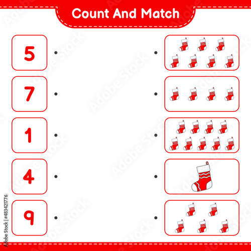 Count and match, count the number of Christmas Sock and match with the right numbers. Educational children game, printable worksheet, vector illustration
