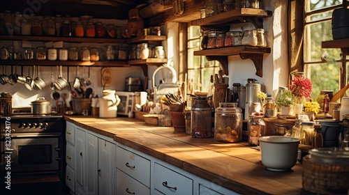 countertop, blurred, rustic, house, interior, illustration, cosy, kitchen, wooden, open, shelf, jar, homemade, preserving, vintage, kitchen utensile, farm, sink, stove, charme, space, soft, lighting, warm, inviting, atmosphere, decor, design, country