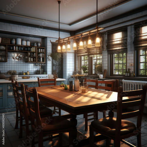 country cottage barn pottery style decoration kitchen and dining area in older high ceiling home style