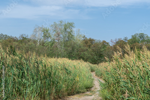 Country road among the green reeds. Stalk cane blowing in the wind from both sides pedestrian path. View on brown bulrush in the swamp. Nature outdoors plants growing.