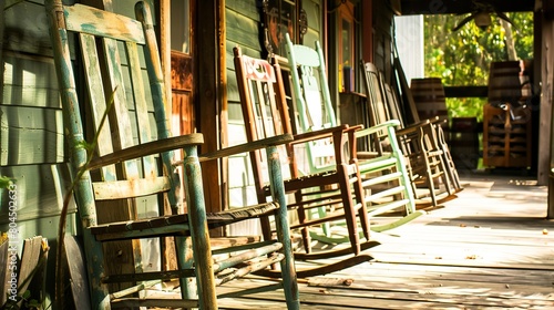 Country store front porch with rocking chairs, close up, invitation to sit and relax, sunny afternoon