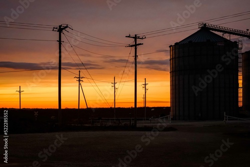 sunset, sky, sun, sunrise, silhouette, landscape, farm, grain, gravel, gravel road, working