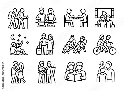 Couple Activity Icons. Outline icon set of couple bonding activities: hiking, cooking together, board games,
