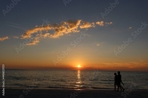 sunset, beach, sea, silhouette, ocean, sun, sky, sunrise, couple, people, water, walking, sand, coast, romantic, nature, orange, summer, woman, walk, evening, dusk, love, cloud, florida