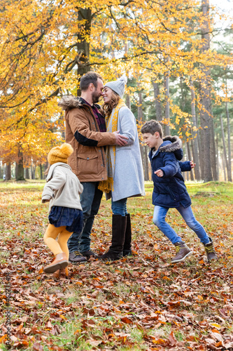 couple, doing, romance, standing, children, running, forest, family, playing, 4, people, adult, girl, boy, group, woman, man, outdoors, autumn, season, preschool, toddler, elementary, sibling, leisure, mid, mature, female, male, father, mother, daughter, son, togetherness, caucasian, bonding, lifestyle, nature, love, falling, warm, clothing, britain, quality time, weekend, activity
