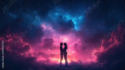 couple, hugs, love, romance, starry, night, sky, cloud, pink, purple, blue, nebula, cosmos, star, galaxy, affection, intimacy, passion, dreamy, magical, romantic, celestial, aethereal, silhouette, togetherness, tenderness, serenity, peace, hope, dream