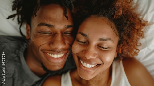 Couple enjoying a joyful moment together in a bedroom, laughing and capturing a selfie, showcasing their happy relationship and commitment
