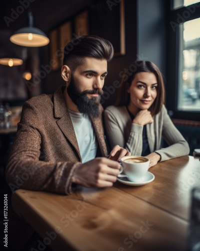 couple, cafes, hot drink, man, woman, date, love, romance, human relationships, indoor, eatery, bar, brown, beard, coiffure, casual attire, stylish, attractive, happy, relaxed, conversation, intimacy, togetherness, warm, cosy, wooden, table, cup, latte, cappuccino, drink, enjoying, moment, sitting, light, dark, window, interior, design, atmosphere