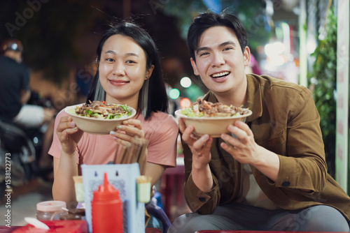 Couple enjoying delicious Vietnamese noodle bowls in Hanoi at night