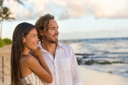 Couple enjoying honeymoon vacation tropical beach. Portrait of happy Asian girl and Caucasian man smiling relaxing on summer travel holidays. Luxury resort newlyweds concept.
