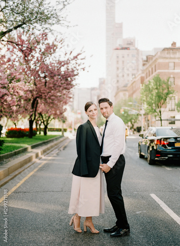 couple, engagement, city, street, cherry, blossom, spring, celebration, love, romance, lifestyle, smiling, fashion, togetherness, urban, happiness, human relationships, joy, nature, sunlight, holding, hand, beautiful, day, dressed, floral, tree, romantic, atmosphere, elegant, attire, iconic, scenic, fresh, air, metropolitan, joyful, moment, pastel, colours, goal, intimate, story, ambience, colourful, flower, life, bright