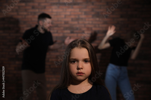 Couple fighting indoors, focus on their unhappy little daughter. Domestic violence