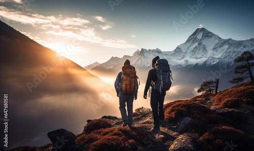 Couple hiker traveling, walking in Himalayas under sunset light. Man and Woman traveler enjoys with backpack hiking in mountains. Travel, adventure, relax, recharge concept.