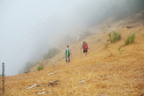 Couple Hiking on a Foggy Mountain Trail Through Dry Grassland and Mist