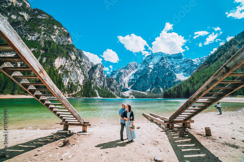 couple hold the hand stand at the end of pier at lake at sand, lago di braies,Dolomite,Italy