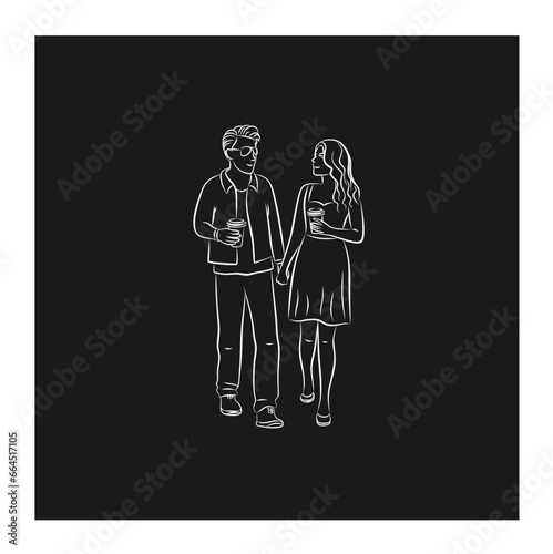 Couple holding hands and drinking coffee. A man and a woman in love are walking. Vector linear illustration