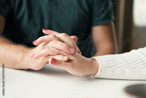 Couple holding hands at home. Happy Man and Woman. Two Loving Hands Together on the Couch Sharing Deep Affection and Love in Details. Intimate connection. Close-up of Intertwined female and male hands