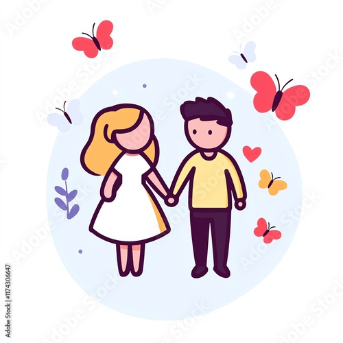 Couple holding hands, surrounded by butterflies and hearts, flat design illustration.