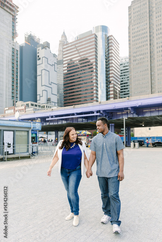 Couple holds hands while walking in an urban setting with skyscrapers in the background during daytime