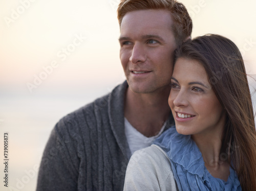 Couple, hug and thinking with love outdoor at sunset planning future holiday together in Florida. Travel, ideas and man with woman on beach, vacation or date in summer with support in marriage