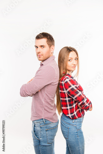Couple in love standing back to back with crossed hands