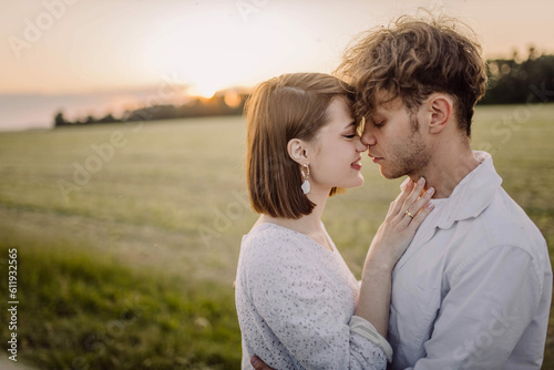 couple in love in a field at sunset on a date in summer. Wedding engagement of a young couple.