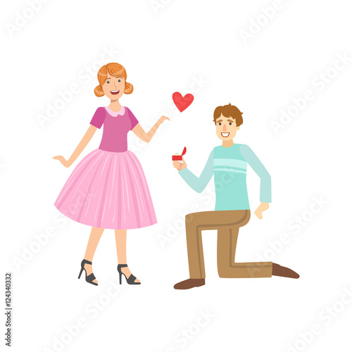 proposing, proposal, ring, box, pink, dress, person, people, man, woman, lover, couple, love, dating, romantic, together, smiling, happy, date, going out, wooing, court, cartoon, simple, simplified, flat, bright, cute, sticker, isolated, drawing, illustration, vector, white, background