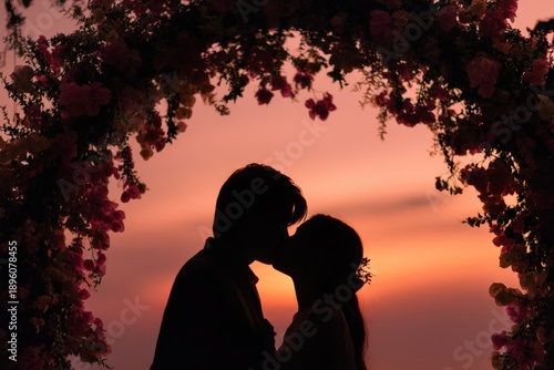 Couple kisses under a floral arch at sunset celebrating their love during a wedding ceremony with vibrant colors in the sky