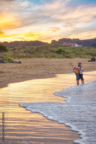 Couple kissing and hugging on the beach with a beautiful sunset in background