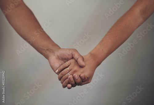 Couple, love and holding hands for support, care and solidarity or romance with studio background. Compassion, partnership or relationship for people, marriage or hope or trust for affection together