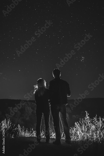 Couple, man and woman look at the sky full of stars, romantic atmosphere. travel. peak, vertical photo, black and white