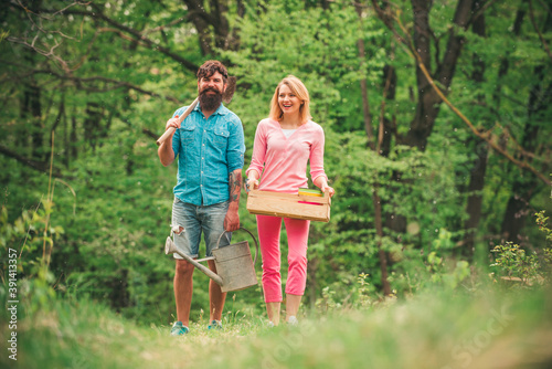 Couple of farmers seedling sprouts in the garden. Country life. Happy Couple Farmers working with spud on spring field. Earth concept.