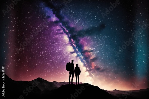 night sky, mountain, twilight, standing, looking, colourful, ai, generative, silhouette, sky, night, star, milky way, galaxy, hiker, couple, illustration
