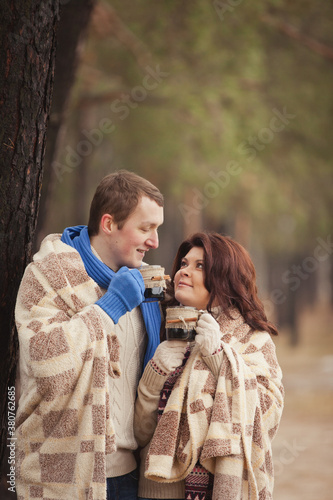 couple on winter walk in snow. Valentine's Day for couple in rustic style. Happy couple in love warming themselves with tea under a blanket in the arms of nature. Casual outfit with Blue accessories