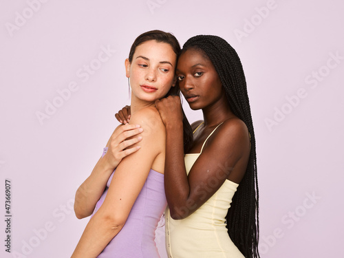 attitude, background, beautiful, beauty, braid, classic, closeness, clothing, confident, contrast, couple, dress, hugs, expressive, fashion, freckle, friends, friendship, coiffure, intimacy, isolated, lilac, long hair, look, model, multiracial, natural, partner, portrait, posing, purple, standing, studio, style, summer, support, together, 2, white