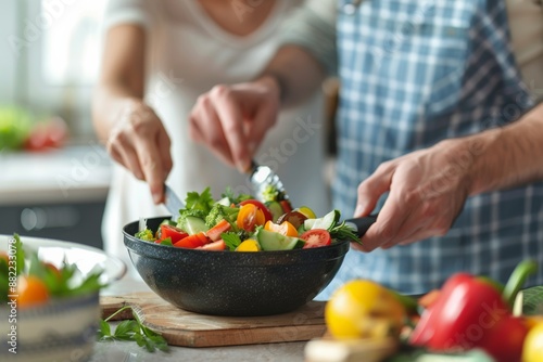 Couple preparing a colorful salad together in the kitchen, promoting nutritious eating habits and teamwork.