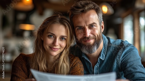 Couple reviewing document, cafe, blurred background, lifestyle use