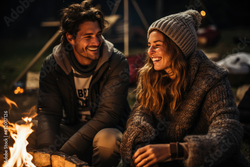 Couple roasting marshmallows by a campfire both in cozy sweaters