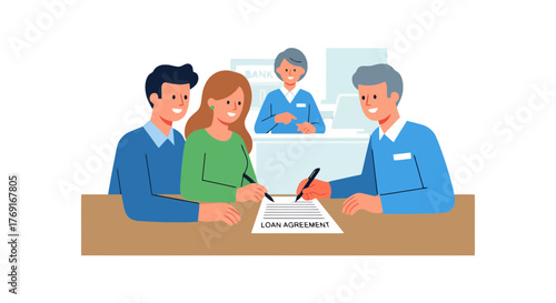 loan, agreements, contract, banking, finance, couple, signature, document, bank, business, marriage, human relationships, credit, mortgage, investment, approval, paperwork, application, borrow, money, financial, consultation, transaction, illustration, adviser, client, handshake, partnership, trust, deal, policy, secure, asset, property, house, home, client, officer, people, happy, signing, purchase, insurance