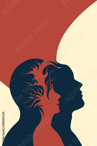 Couple Silhouette Profiles Tree Branches on Red Beige Background Vector