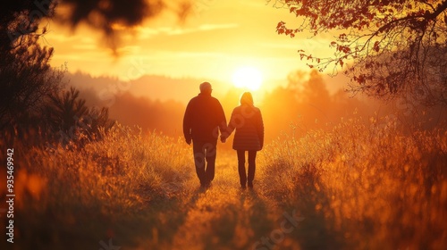 sunset, couple, silhouette, love, romance, golden hour, field, grass, tree, nature, landscape, outdoors, walking, hand in hand, togetherness, affection, together, connection, golden light