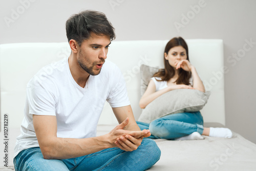 man, male, young, people, white, bed, adult, couple, woman, sad, unhappy, angry, problem, serious, hispanic, home, sitting, quarrel, husband, human relationships, conflict, communication, sofa, upset, wife, divorce, bedchamber, depressed, family, love, stress, frustrated, female, married, issue, trouble, intimate, fight, offended, together, argue, distressed, disappointed, abuse, arguing, challenged, crisis, 2