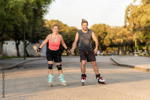 Couple skating holding hands in a street next to a park