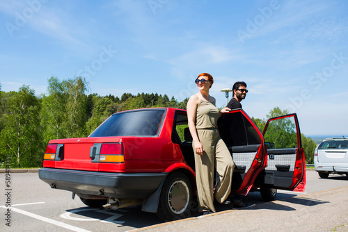 day, outdoors, horizontal, real people, full-length, transportation, car, road trip, travel destination, tour tourism, vacation, red color, free time, leisure, two people, young men