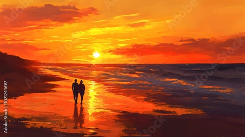 dream, romance, future, gentle, gold, hope, colours, date, journey, together, scene, leisure, nature, orange, care, art, touch, paint, twilight, seascape, walk, couple, evening, happy, light, ocean, scenic, love, life, coastline, coastal, serene, silhouette, horizon, image, support, stroll, sky, seacoast, sunset, affection, artistic, atmosphere, calmness, romantic, peaceful, relaxing, emotional, illustration