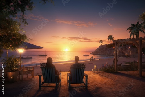 Couple watching sunset at tropical resort, couple on the beach, Generative AI
