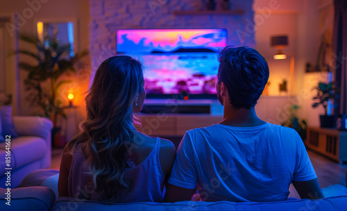 couple, living room, television, watch, motion picture, show, home, evening, night, relax, entertainment, cosy, comfortable, together, human relationships, love, intimacy, screen, couch, sofa, seated, illuminated, warm light, interior, streaming, leisure, relaxation