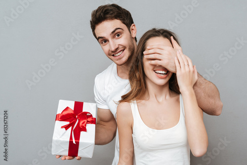 isolated, human, photogenic, relation, guy, 2, attractive, emotional, pair, clothes, boy, studio, casual attire, people, posing, love, portrait, family, youth, lifestyle, young, girl, face, woman, person, together, joy, stylish, looking, beautiful, background, youngster, space, couple, man, brunette, pretty, female, male, grey, gift, present, happy, from, back, closed, holding, camera